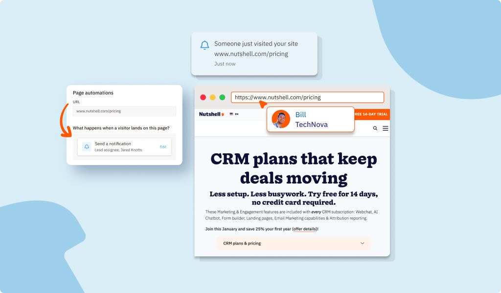 Page-based marketing automations let you trigger sales and marketing workflows when a known lead visits a specific page on your website. Whether that means alerting a sales rep, starting a targeted email sequence, or adding someone to a high-intent audience, Nutshell helps you meet interest with action.
