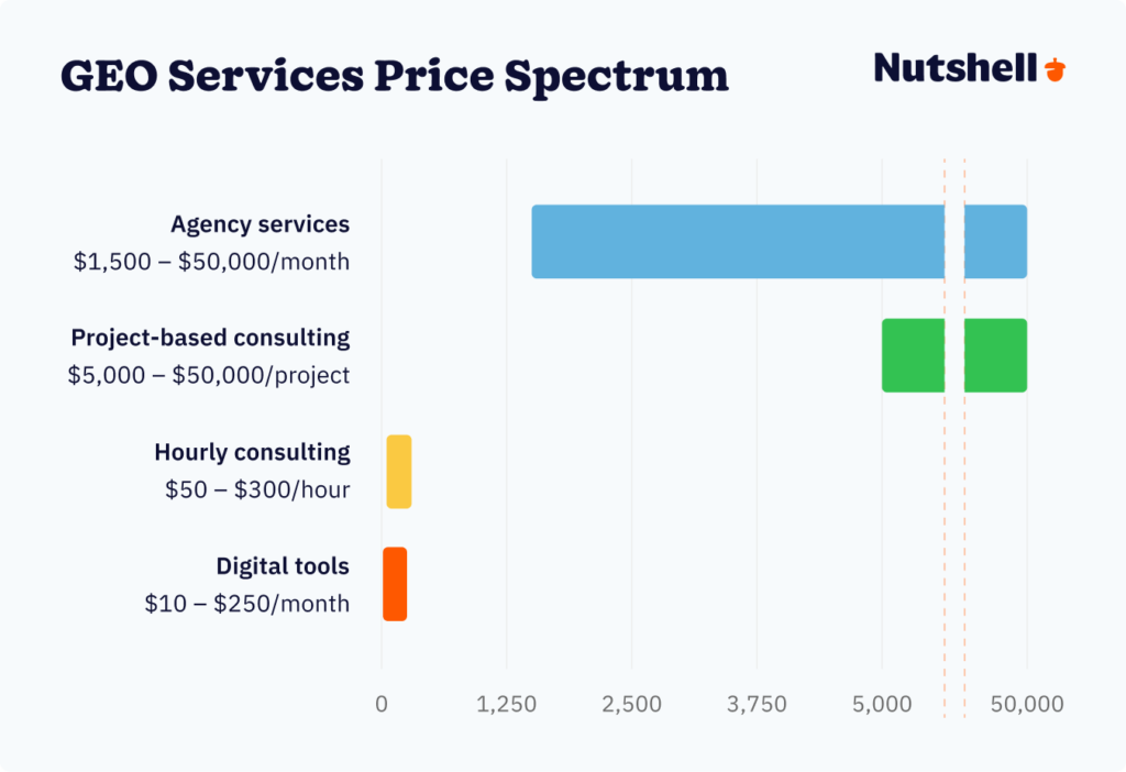 GEO can cost anywhere from $10 to $50,000, depending on how you choose to implement your strategy and how much support your business needs. Some companies invest in a few tools or consulting hours, while others pay for full-service agency support and ongoing visibility tracking.