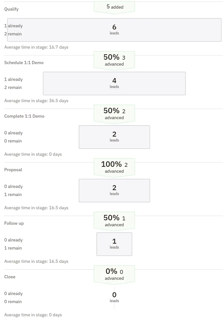 The conversion rates found in the sales funnel report are a response to things that your sales team can control – sales rep actions, how they communicate, and how often they’re reaching out and working to move leads through the sales deal pipeline.