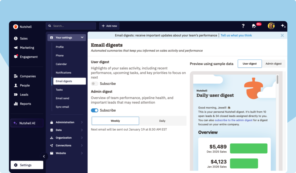 Email digests are available to all Nutshell teams on Nutshell Sales Pro and above..
