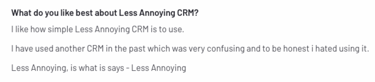 For Less Annoying CRM, it’s similar to the way it is with reporting—it has some good integration options, but not to the same extent as other CRMs. Users often report frustrations with this CRM for not integrating with particular platforms.