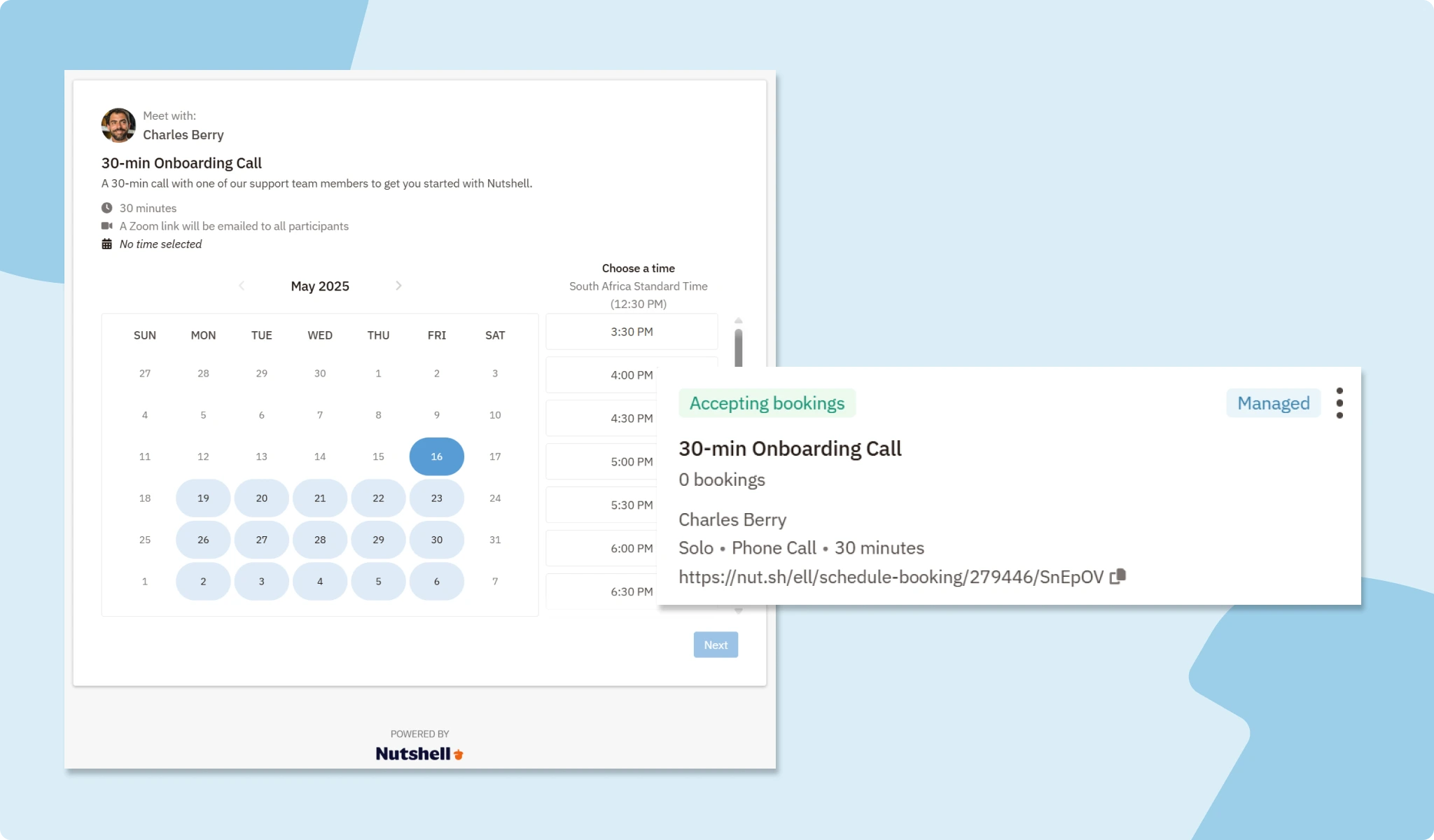 Simplify meeting management, save your sales team time, and ensure consistent booking experiences with Nutshell Scheduler’s managed meetings feature. With it, Nutshell admins can create, assign, and manage templated meetings for your sales team to share with leads and customers.