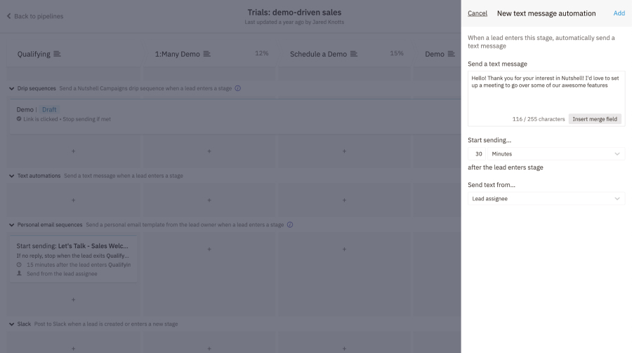 Teams can also use text messages in sales automation to keep leads engaged during the sales process. You can add text automation to your pipelines, choose a sender, and set a delay before sending.