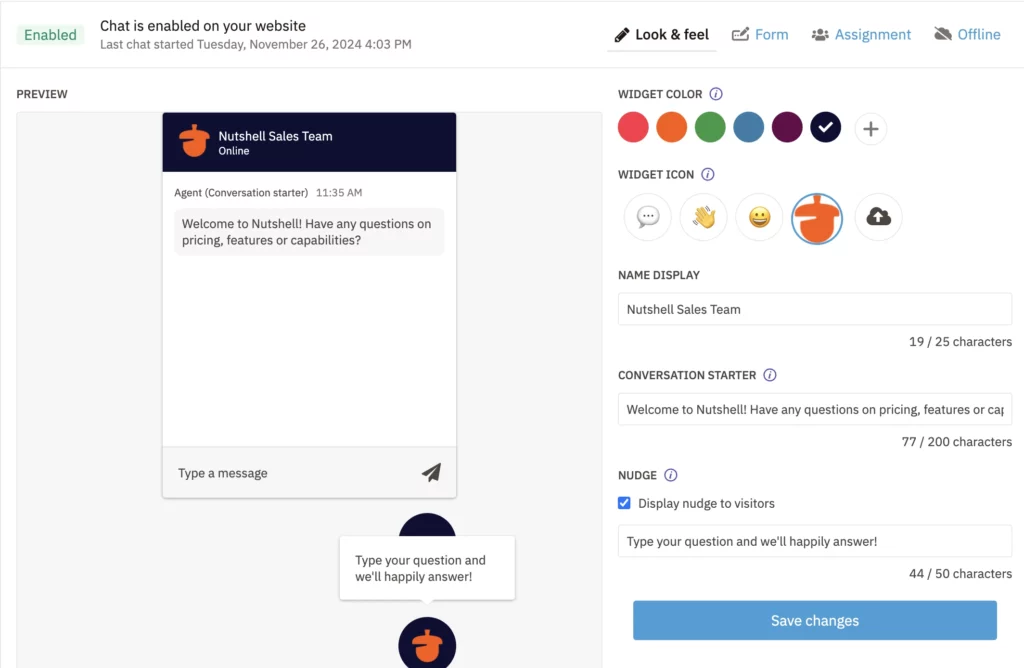 Web chat is a web-based messaging feature that lets website visitors connect with your team directly from your website through a chat widget. Because Chat is built right into Nutshell, you can manage messages, quickly create new leads and assign them to your sales pipelines, and sync the information you collect about the visitor to their page in Nutshell.