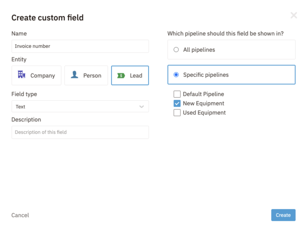 When creating a custom field, choose whether to show the field across all pipelines or only for specific pipelines. Then select the pipeline (or pipelines) where you’d like to assign the custom fields. In the image above, we’ve created a custom field called “Invoice number” and assigned it to our New Equipment pipeline.