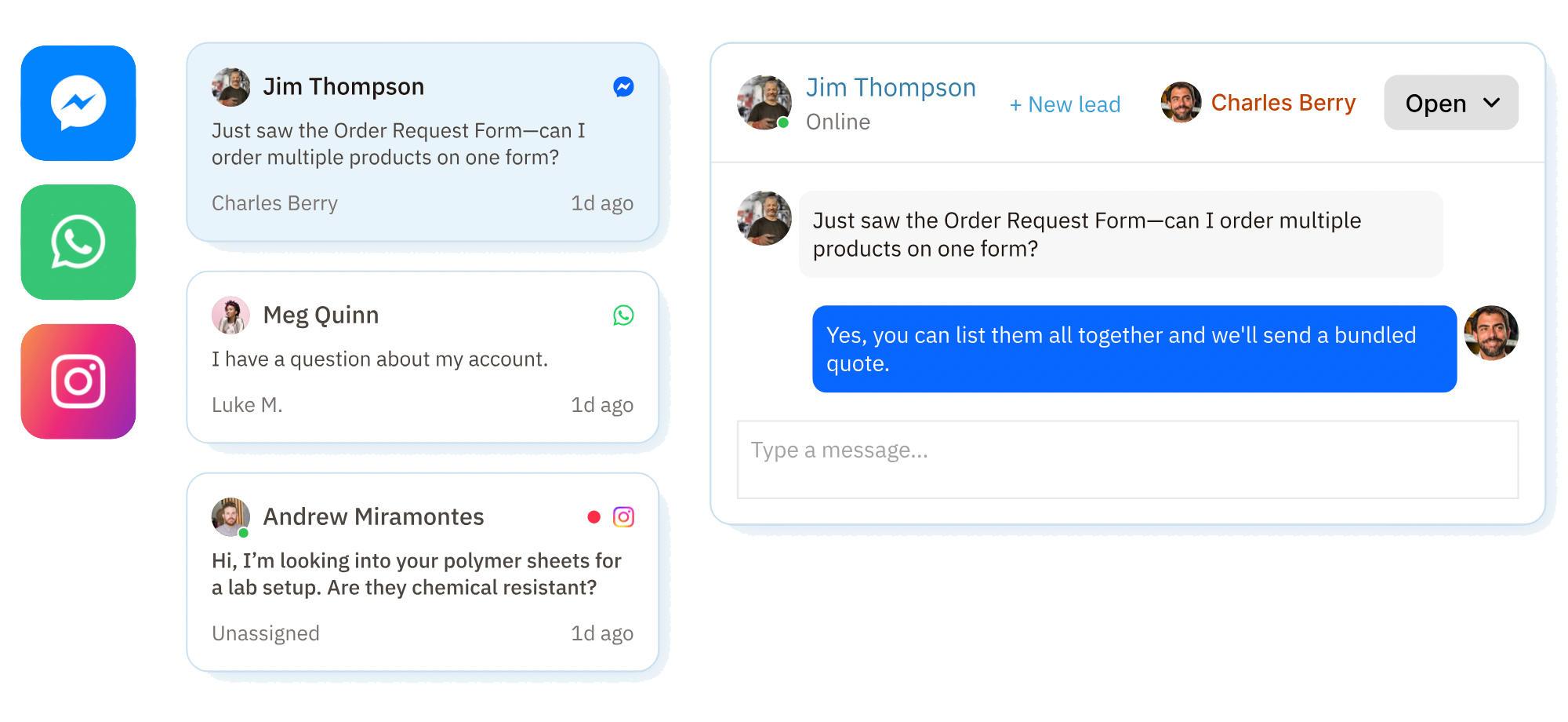 Absolutely. Nutshell’s Engagement Inbox consolidates all your conversations—SMS, web chat, WhatsApp, Facebook Messenger, and Instagram DMs—in one place. You can assign threads, track conversations, and respond without switching between tools or tabs.
