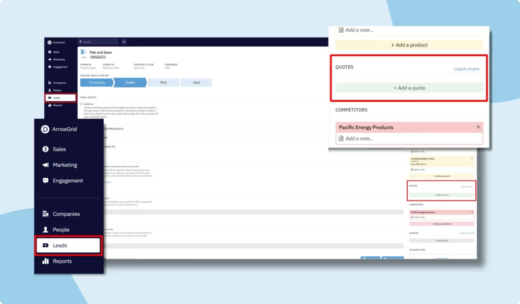 No more copying data into separate quoting software or spreadsheets—Everything stays in one centralized hub, tied to your leads and contacts. That means your reps can spend less time on ‘paperwork’ or duplicate tasks, and spend more time closing deals while managers get complete visibility into every quote’s status.